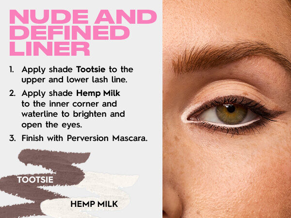 • Use the nude shades like Hemp Milk (matte white), Beige Flag (cool beige), or Caffeinated (cool light brown) in your lower waterline close to the lashes to give eyes a brightened, more awake look. - How to Brighten Inner Corner of Eyes: